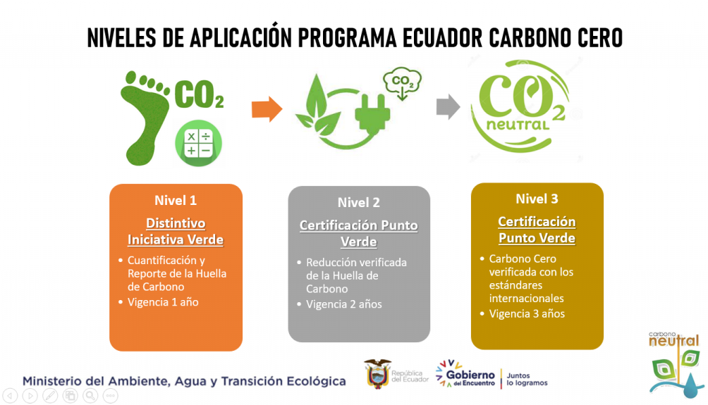 El “Programa Ecuador Carbono Cero – PECC” surge como una propuesta del MAATE, este programa tiene por objetivo promover e incentivar, en el sector productivo y de servicios del país, la implementación de medidas y acciones para la cuantificación, reducción y neutralización de las emisiones de gases de efecto invernadero (GEI) producidas en sus diferentes procesos y actividades, esto, bajo un esquema transparente y verificable, permitiendo a su vez, el mejoramiento del desempeño ambiental y posicionamiento competitivo, además del acceso a otros incentivos y beneficios.