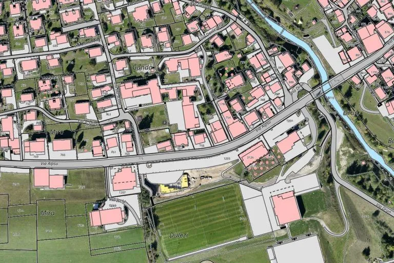 Los drones topográficos generan ortomosaicos de alta resolución y modelos 3D detallados de áreas donde hay datos disponibles de baja calidad, desactualizados o incluso sin datos. De este modo, permiten producir mapas catastrales de alta precisión de forma rápida y sencilla, incluso en entornos complejos o de difícil acceso. Los topógrafos también pueden extraer características de las imágenes, como señales, aceras, marcadores de carreteras, hidrantes y desagües.